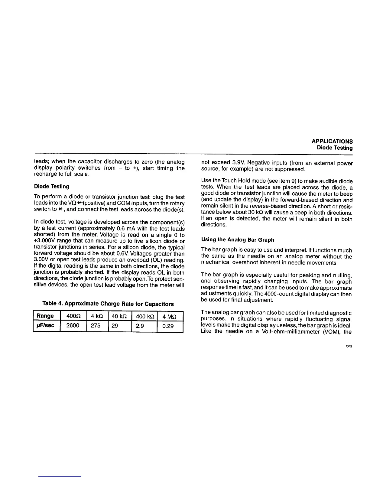 Fluke 83 - Diode Testing; Approximate Charge Rate for Capacitors; Using the Analog Bar Graph