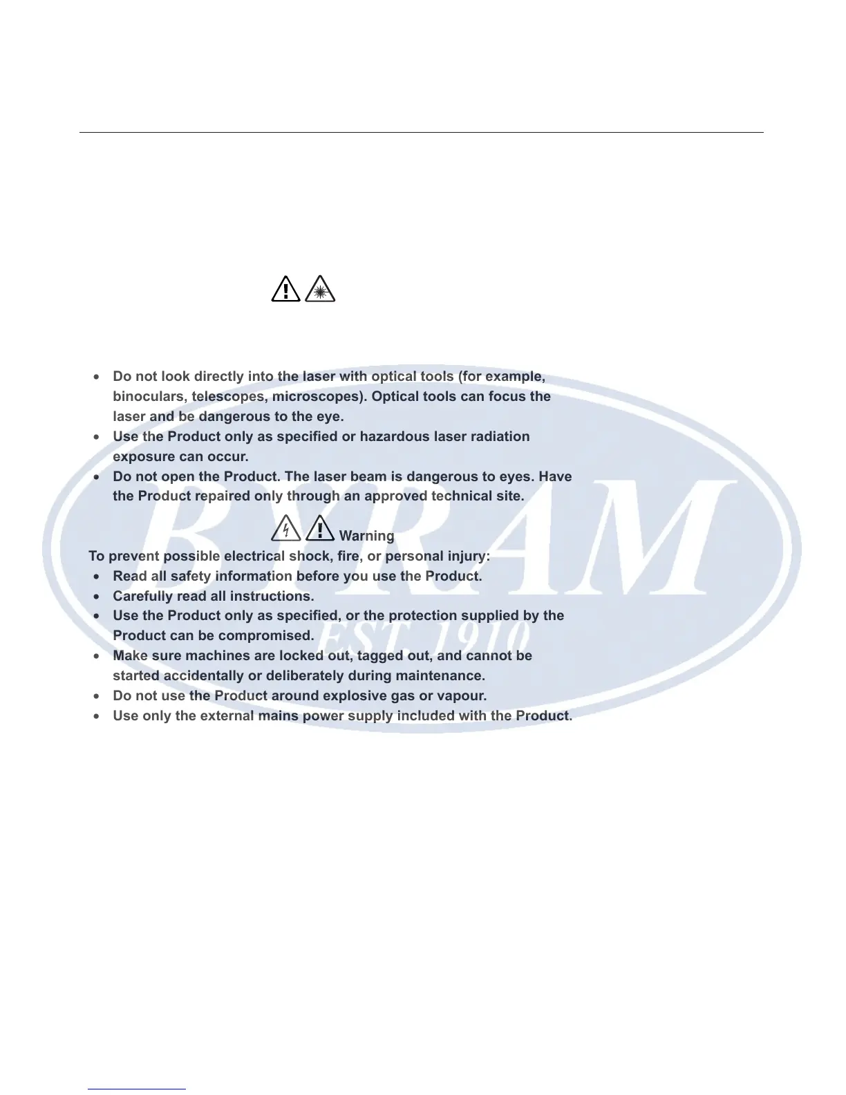 • Do not open the Product. The laser beam is dangerous to eyes. Have
