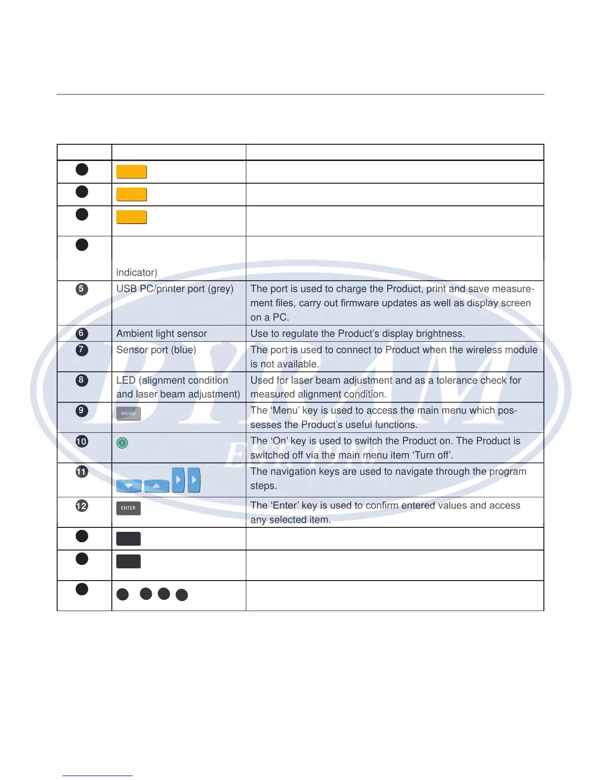 USB PC/printer port (grey) The port is used to charge the Product, print and save measure-
