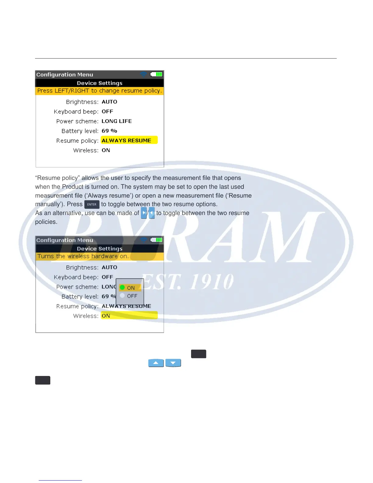 enable ‘wireless’ capability) or ‘off’ (to disenable ‘wireless’ capability), then press