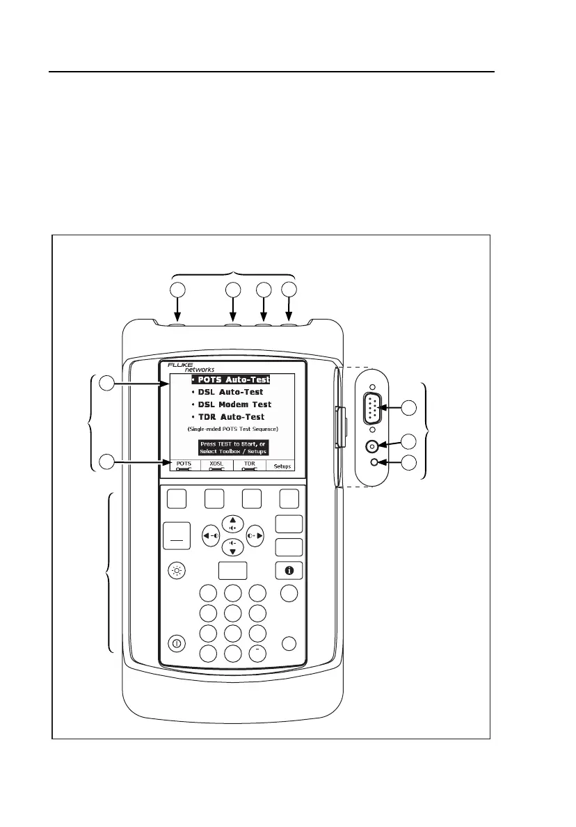 Figure 2-1 identifies the elements on the tester’s front, top, and side panels.