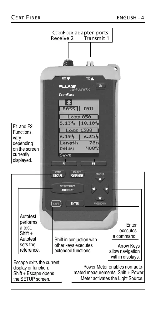 Fluke CertiFiber - CertiFiber Unit Interface; Function Key Operations (F1;F2); CertiFiber Keypad Operations