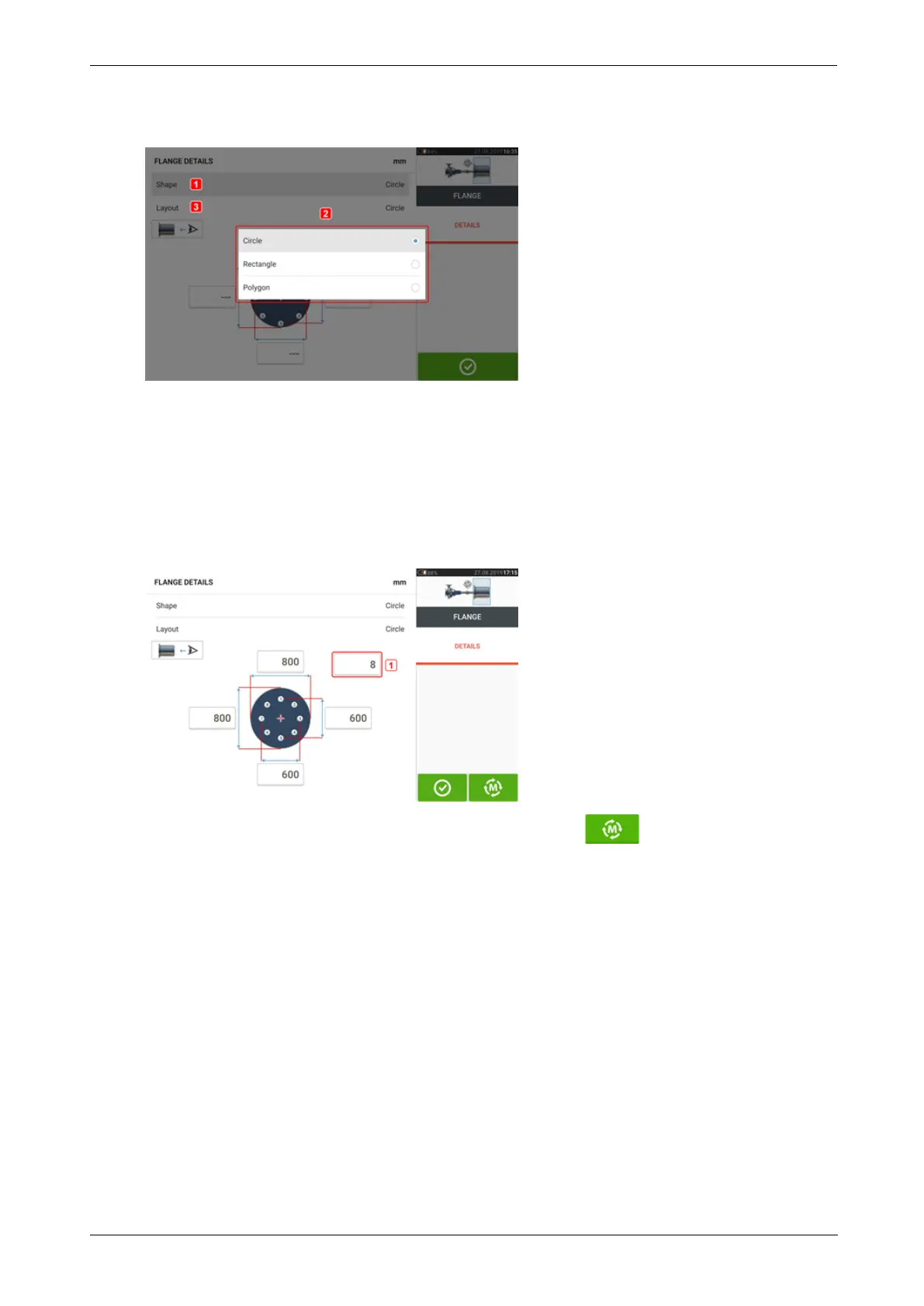 l Tap 'Flange' to access the "Flange details" screen where the flange may be edited.