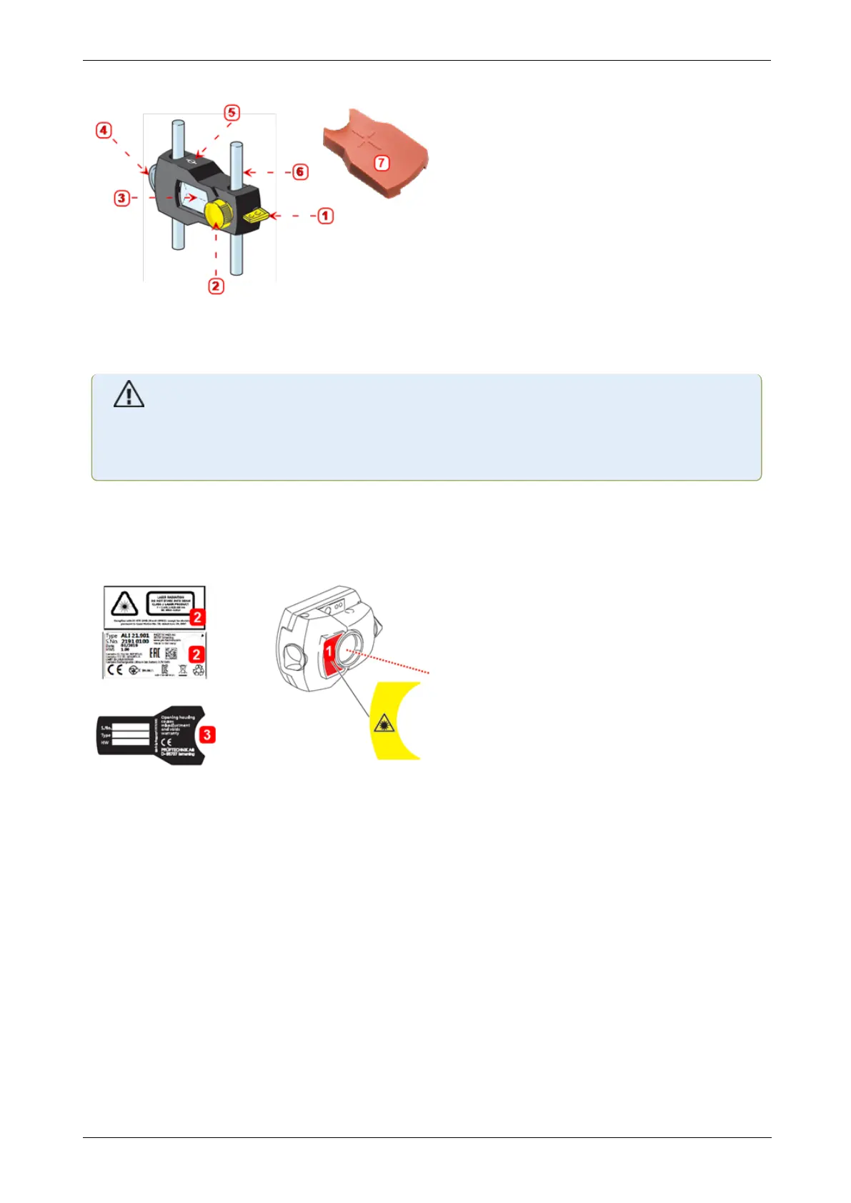 l (1) The laser safety warning symbol label is affixed on the front of the sensor.