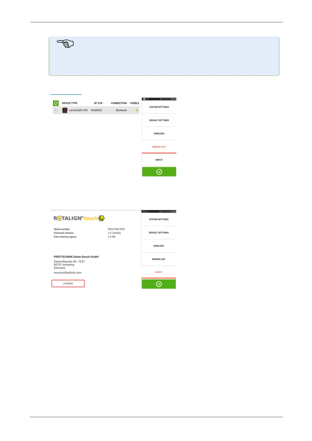 l The "About" screen displays the device features level (ROTALIGNtouch EX ), serial num-