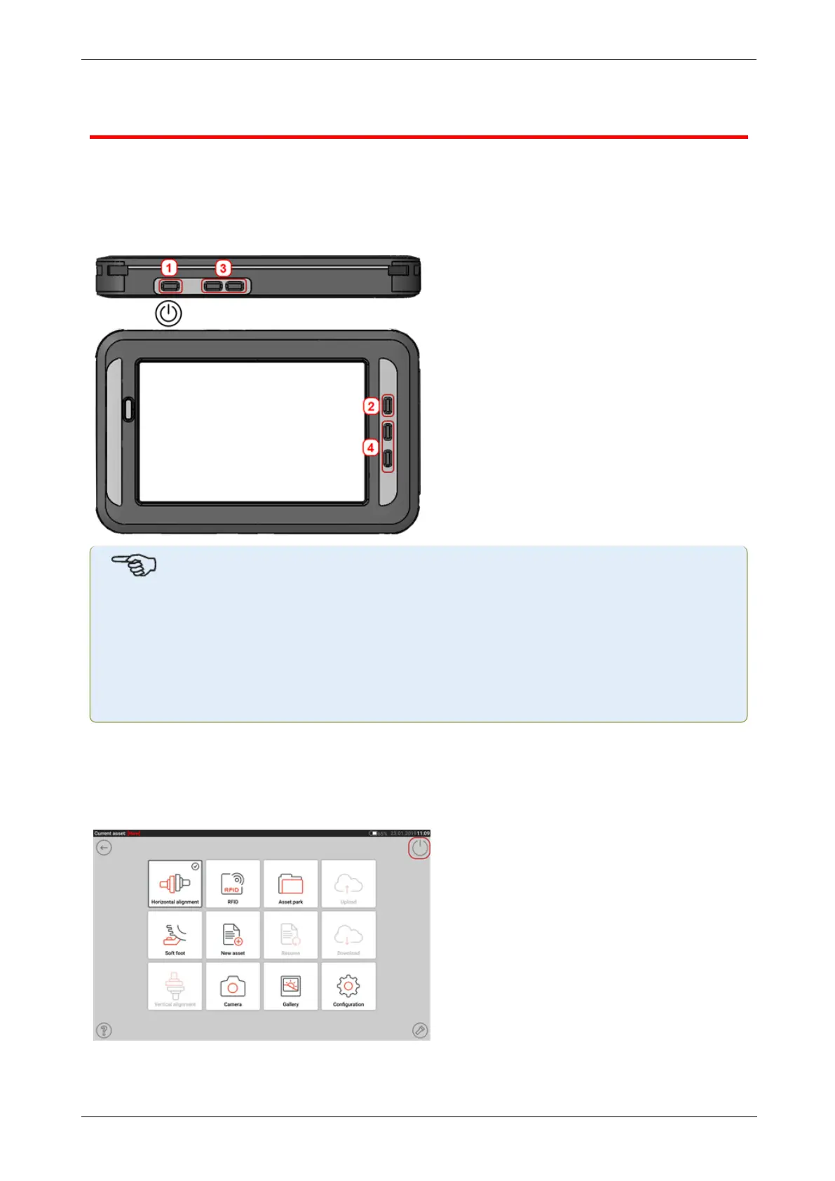 Switch the ruggedized tablet on by pressing and holding down the power key (1). Once