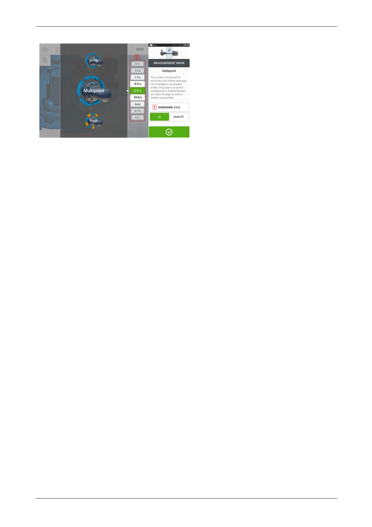 Set the averaging by tapping the 'Averaging' button [1]. A scale [2] used to set the averaging