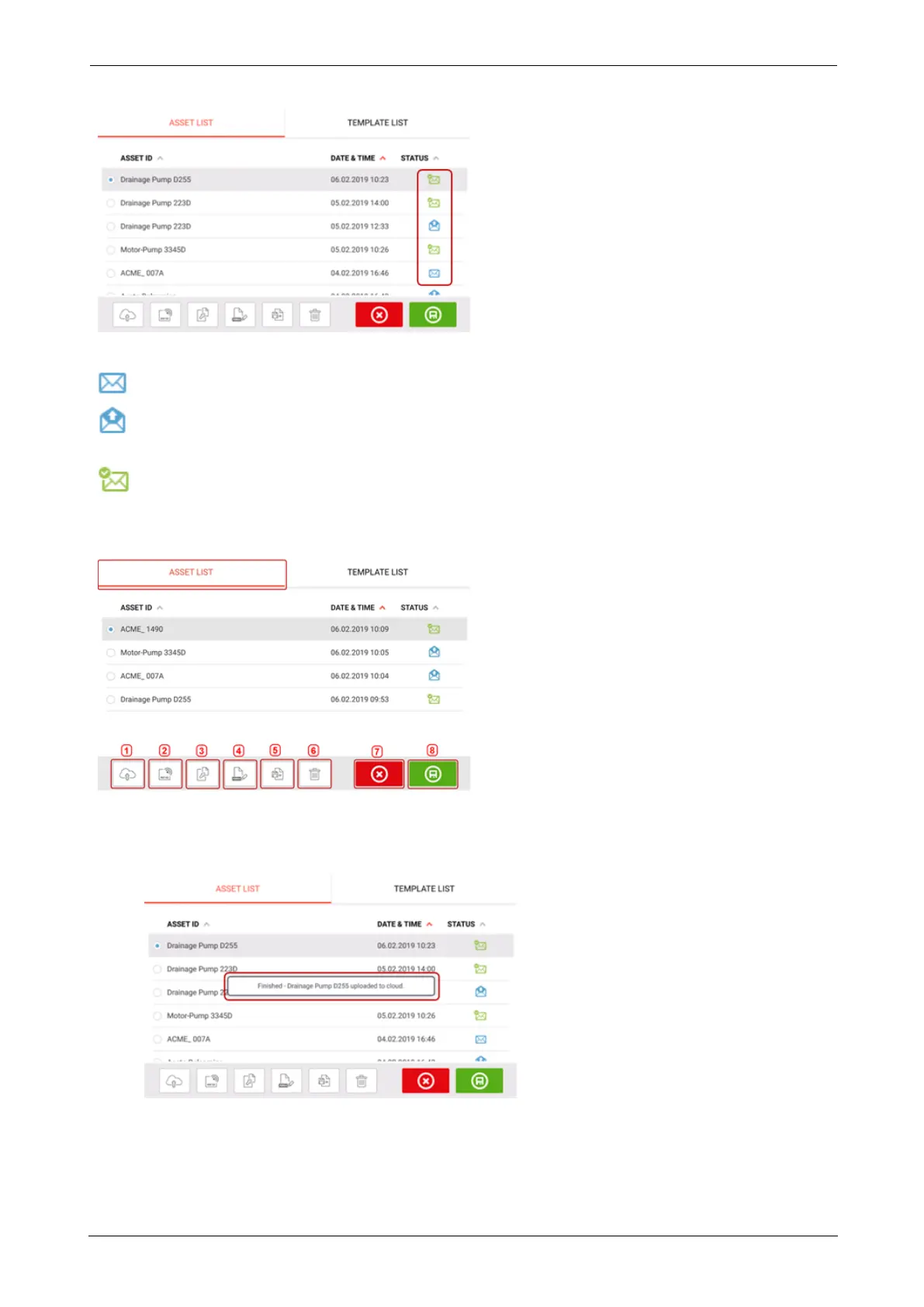 The status envelopes indicate whether an asset has been measured or not.