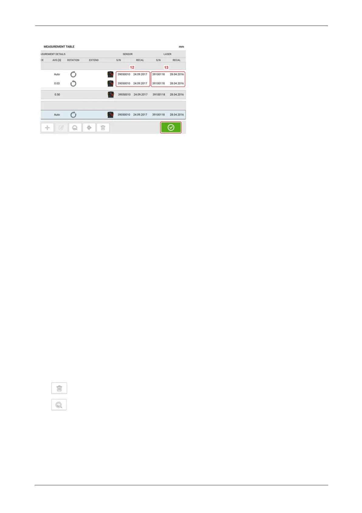 Tap to delete highlighted "AS LEFT" reading from the measurement table.