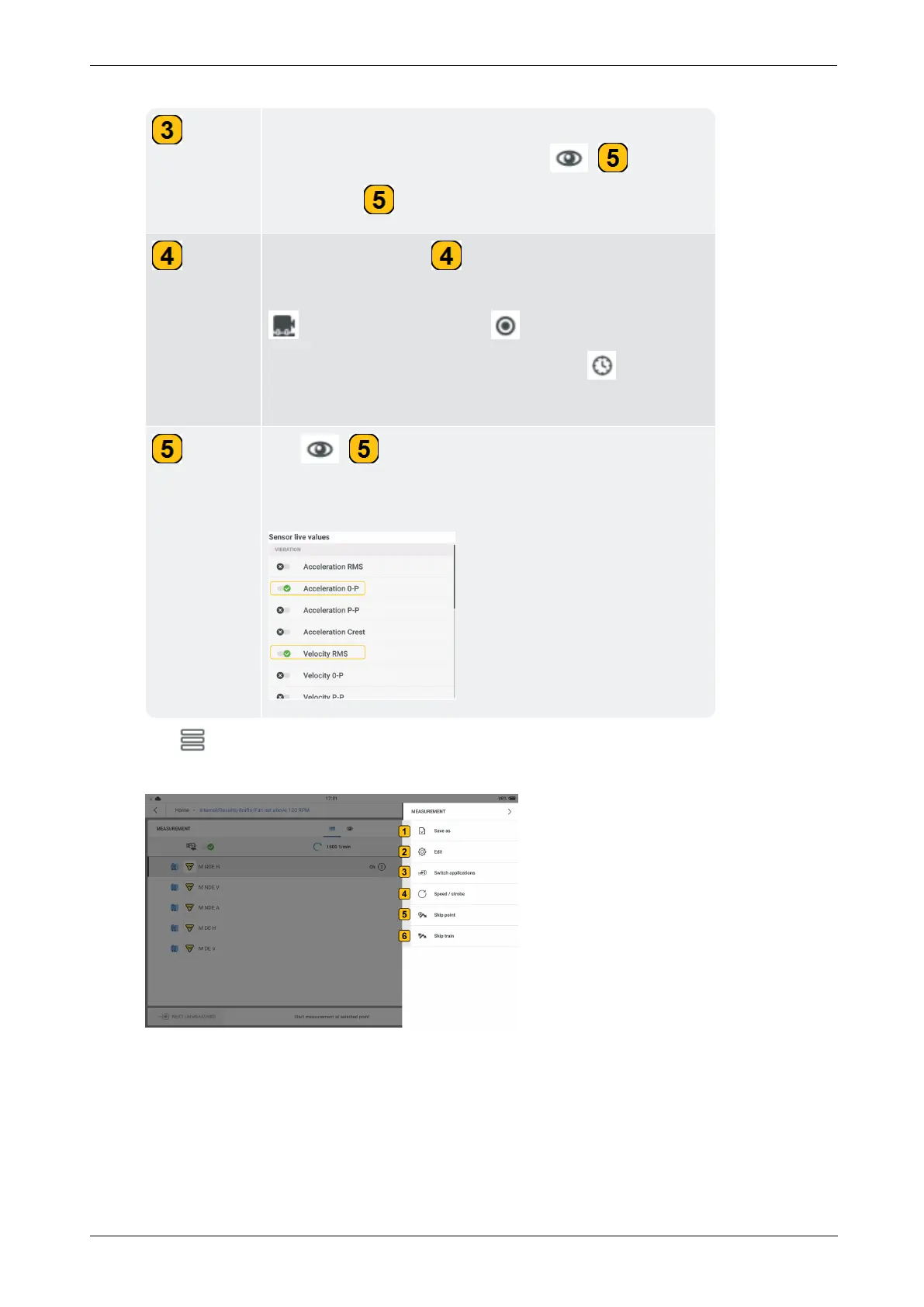 Shows live values. The shown vibration and dis-