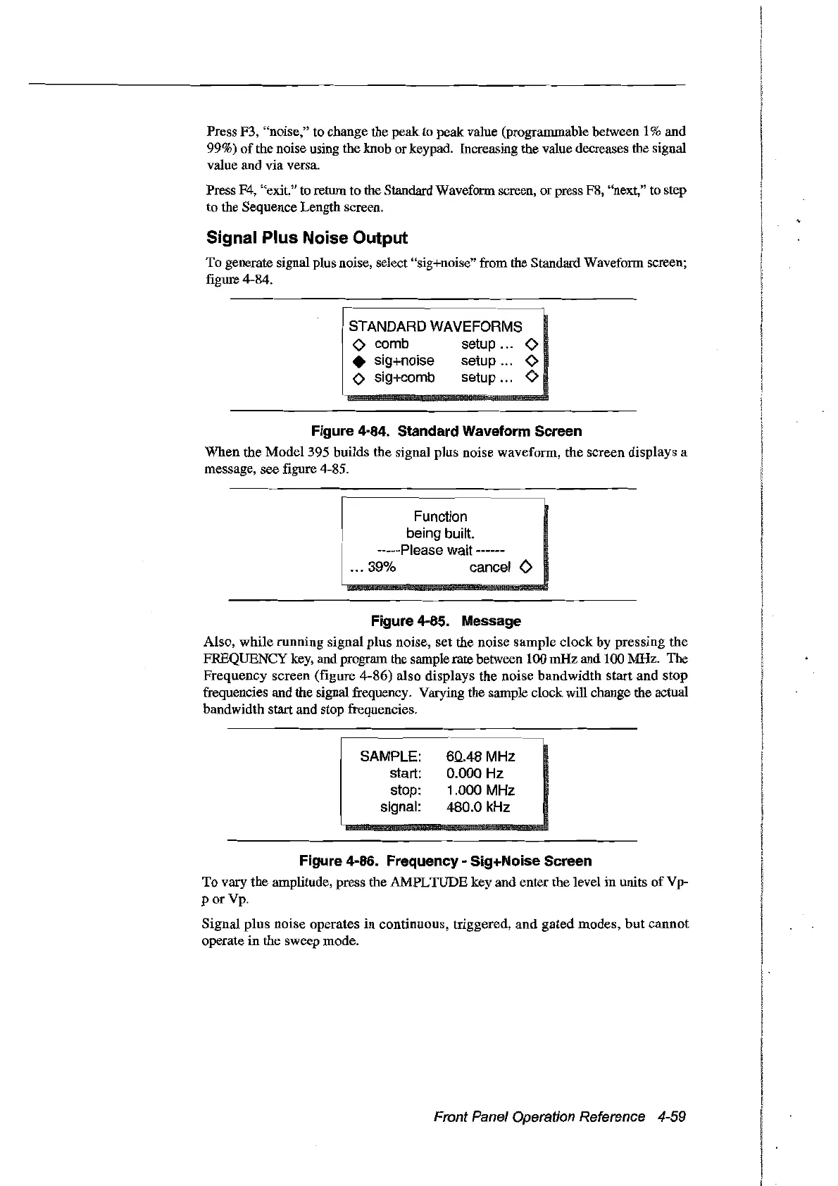 When the Model 395 builds the signal plus noise waveform, the screen displays a