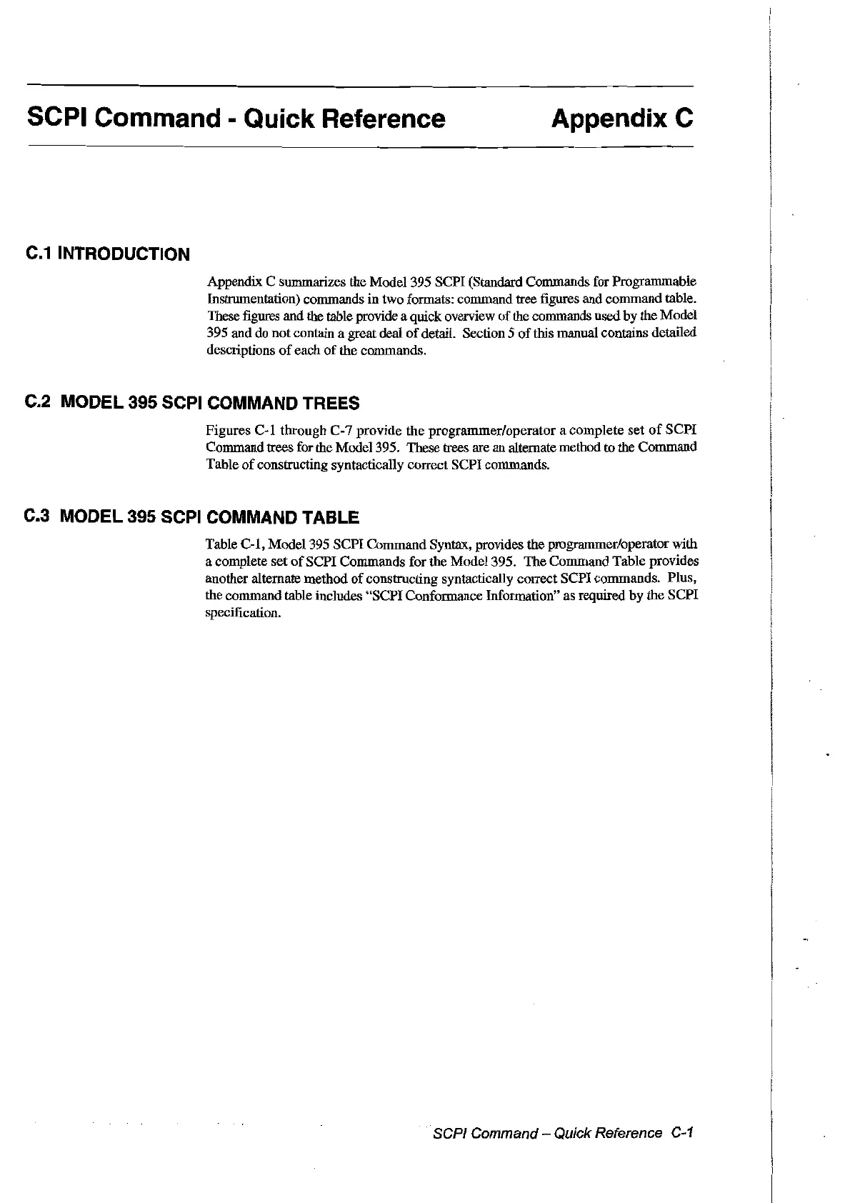 Appendix C summarizes the Model 395 SCPI (Standard Commands for Programmable