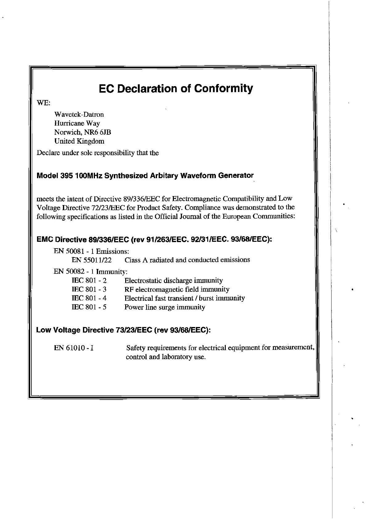 Low Voltage Directive 73/23/EEC (rev 93/68IEEC):