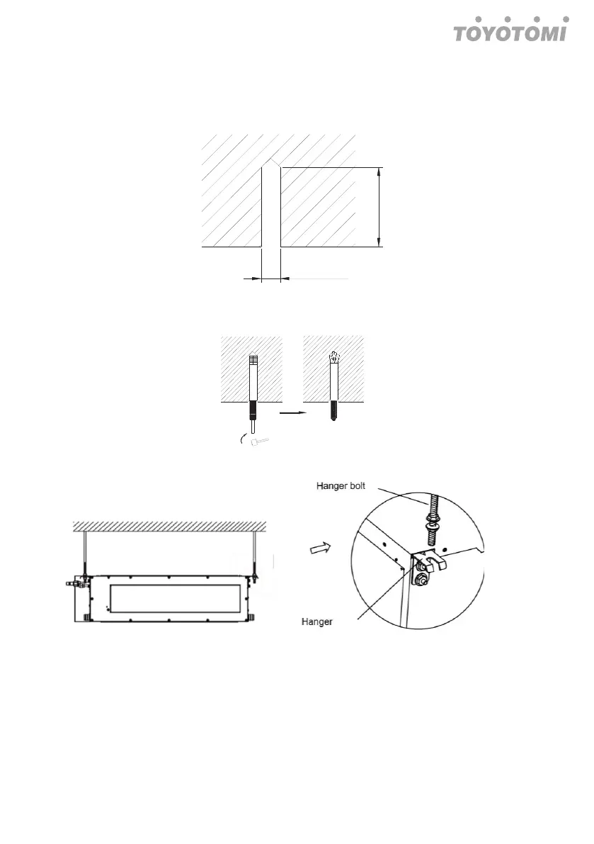 (1) Install the bolts to the ceiling at a place strong enough to hang the unit. Mark