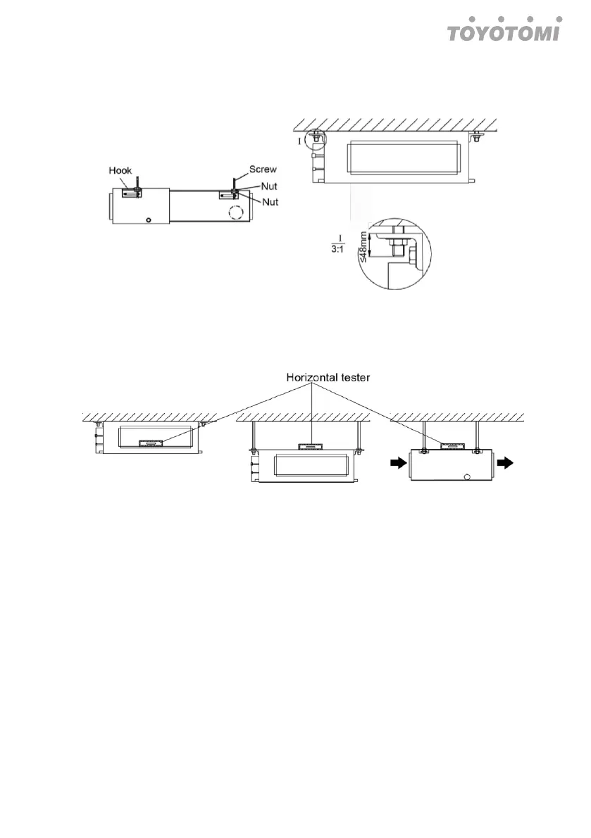 (4) Pass the unit hangers over the bolts installed to the ceiling and install the unit