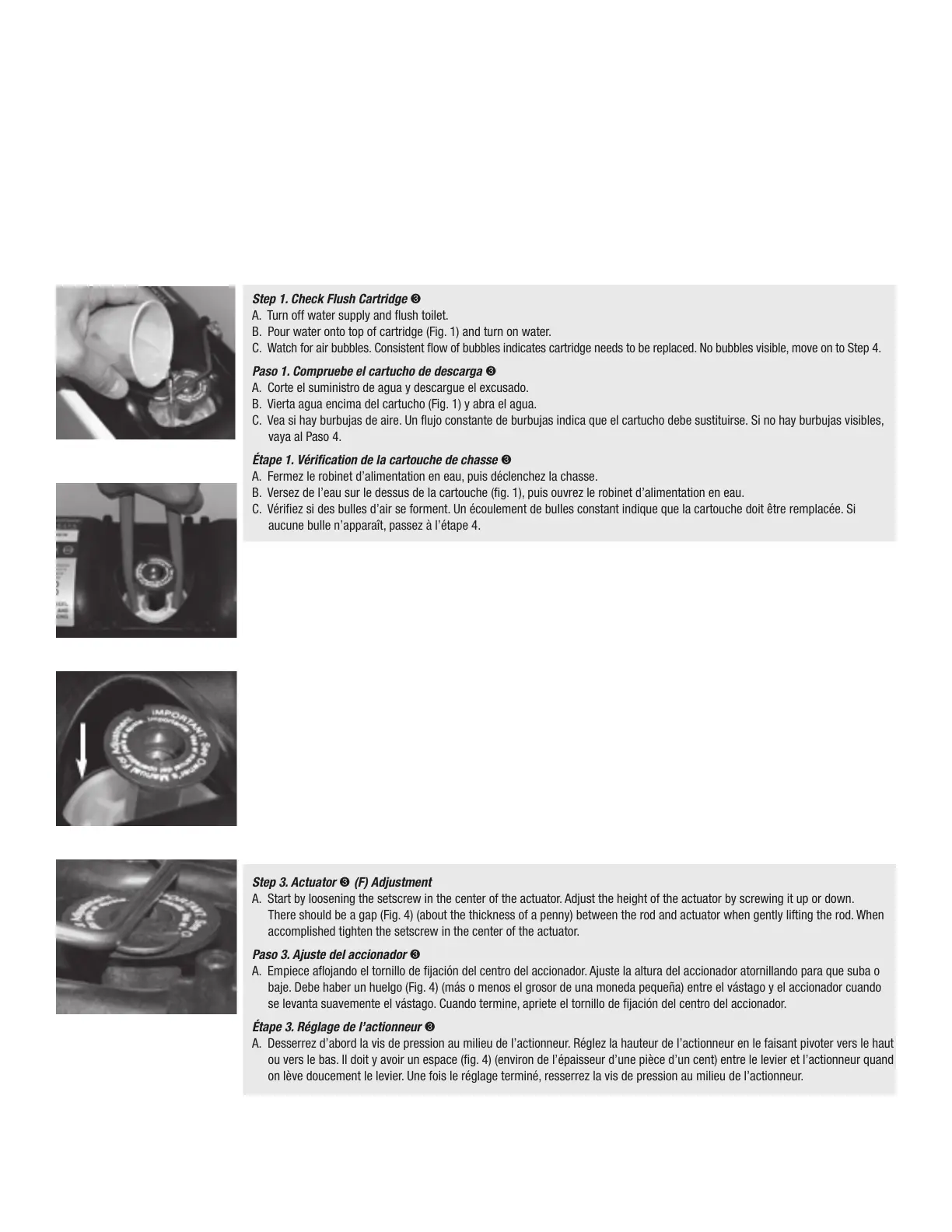 D. Turn on water. Continue to screw in cartridge slowly, 1/8 to 1/4 turn increments until water stops running into the bowl and tank