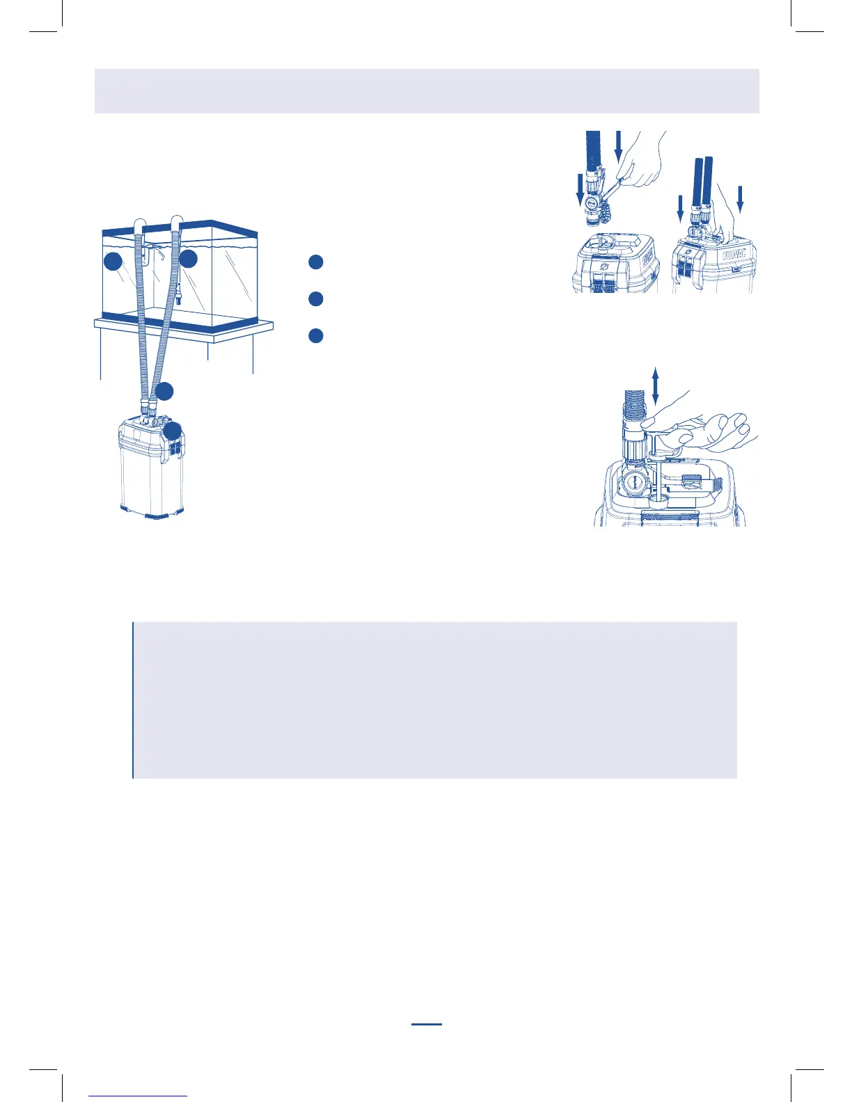 IMPORTANT : Pour éviter tout dommage, ne jamais brancher le filtre si le boîtier n’est pas complètement rempli d’eau.