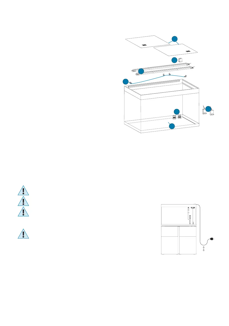 5. FORSIGTIG – 5. FORSIGTIG - Træk altid stikket ud eller frakobl alle apparater i akvariet fra strømforsyningen, inden hænderne kommes ned