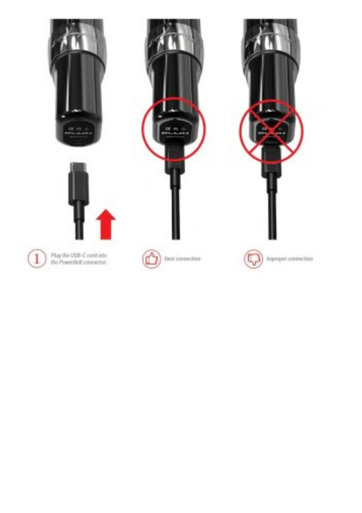 not meant to operate Plug the USB-C cord into the PowerBolt connector. 1 Best connection Improper