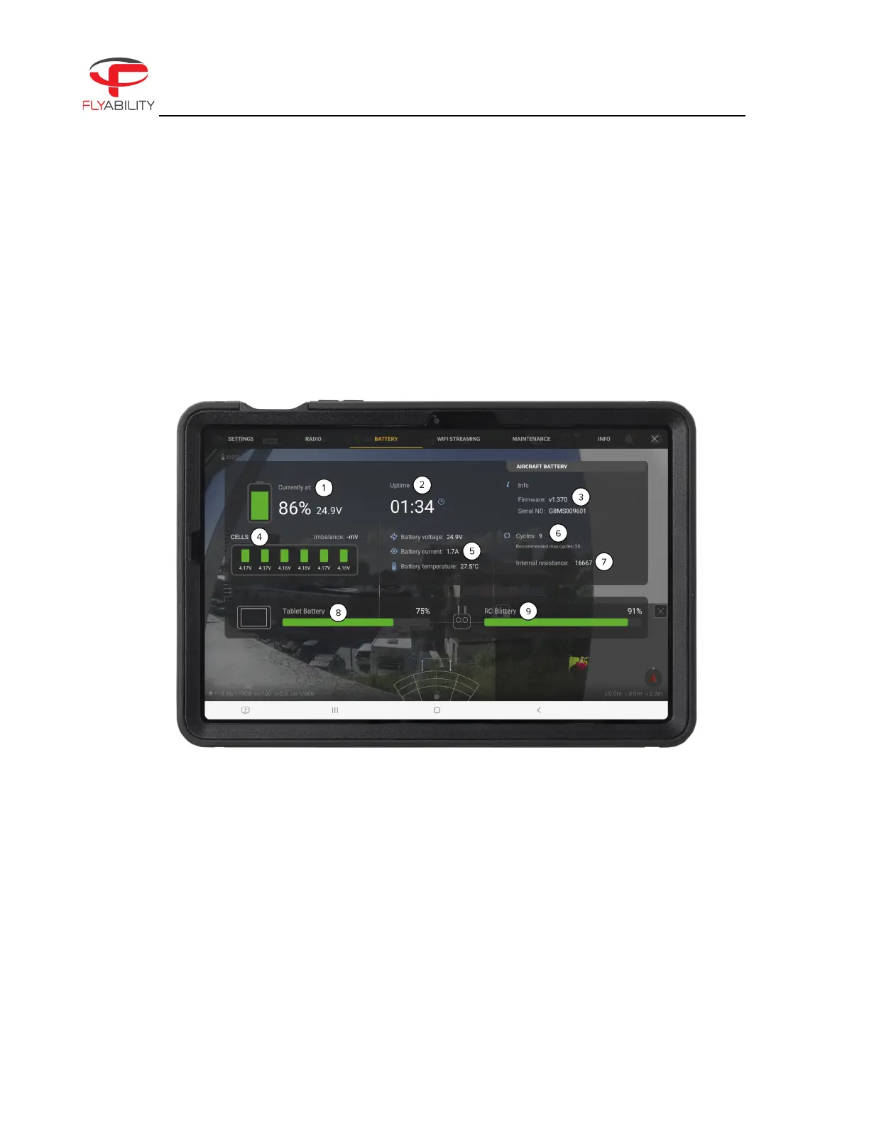 1. Aircraft battery remaining charge and voltage.