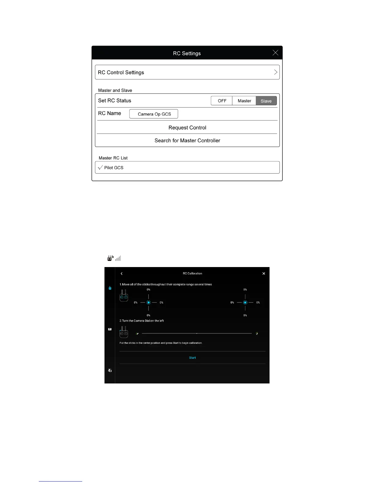 2. Camera View > > RC Control Settings > RC calibration. Tap on “Start”