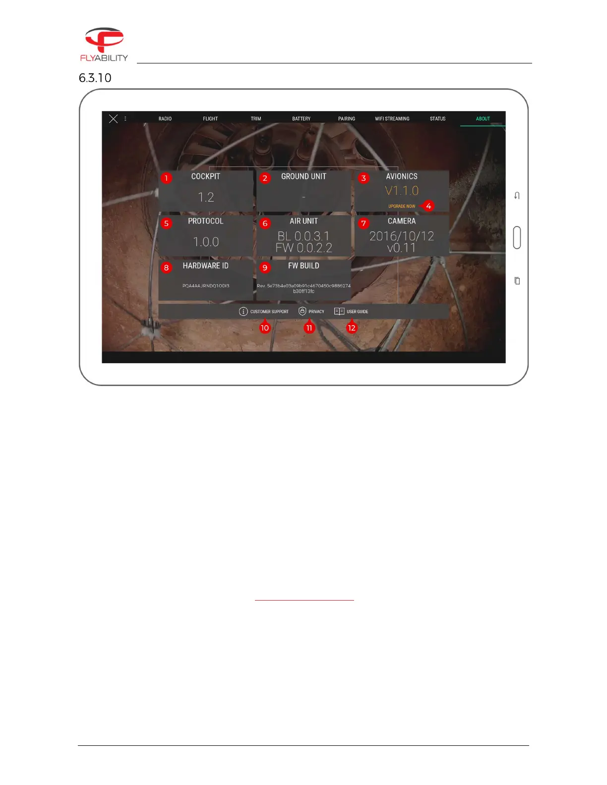 Only on ELIOS 1 – Avionics upgrade button (visible if connected aircraft requires a firmware upgrade,