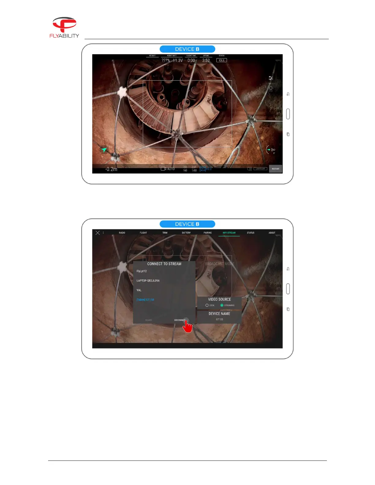 On device B, press the Disconnect button below the streaming sources list.
