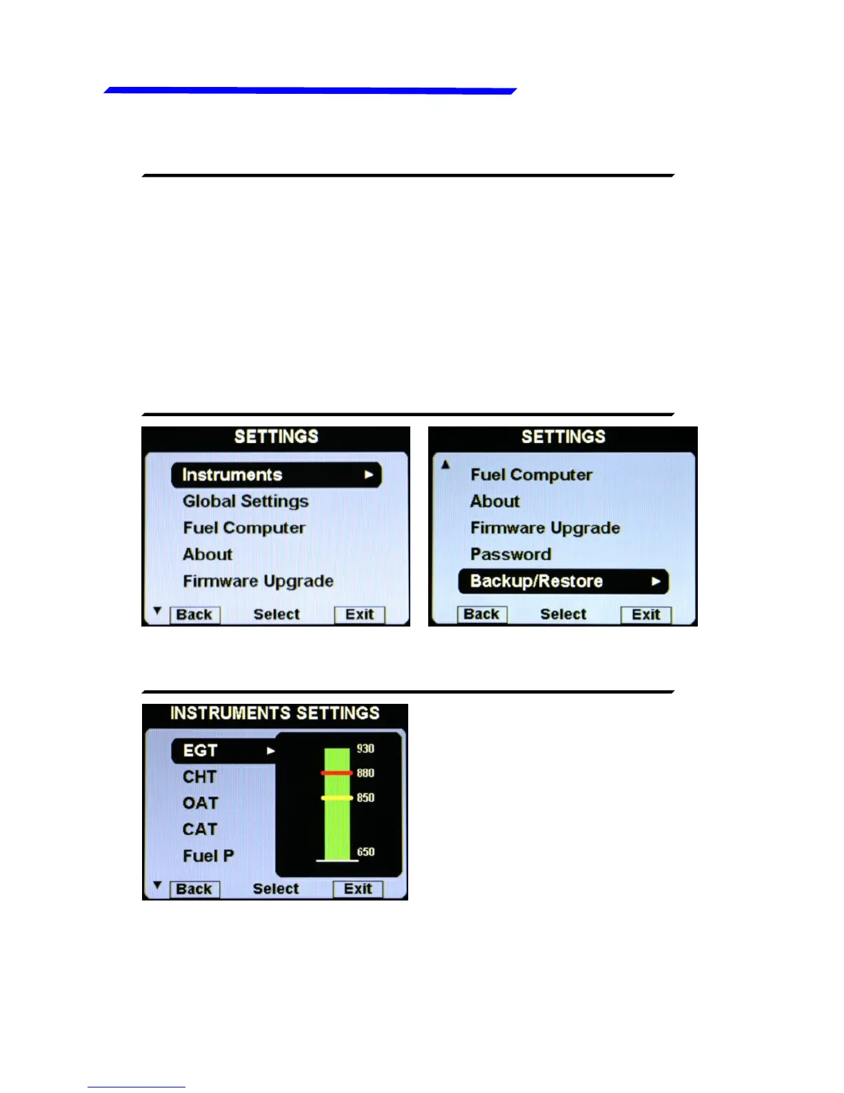 Flybox Vigilus - Main and Settings Menus; Sensor Setup Menus (EGT, CHT, OAT, etc.)