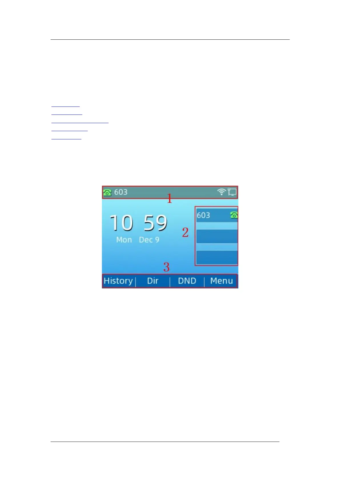 The idle screen is made up of the status bar, line keys, and soft keys. The time & date in the