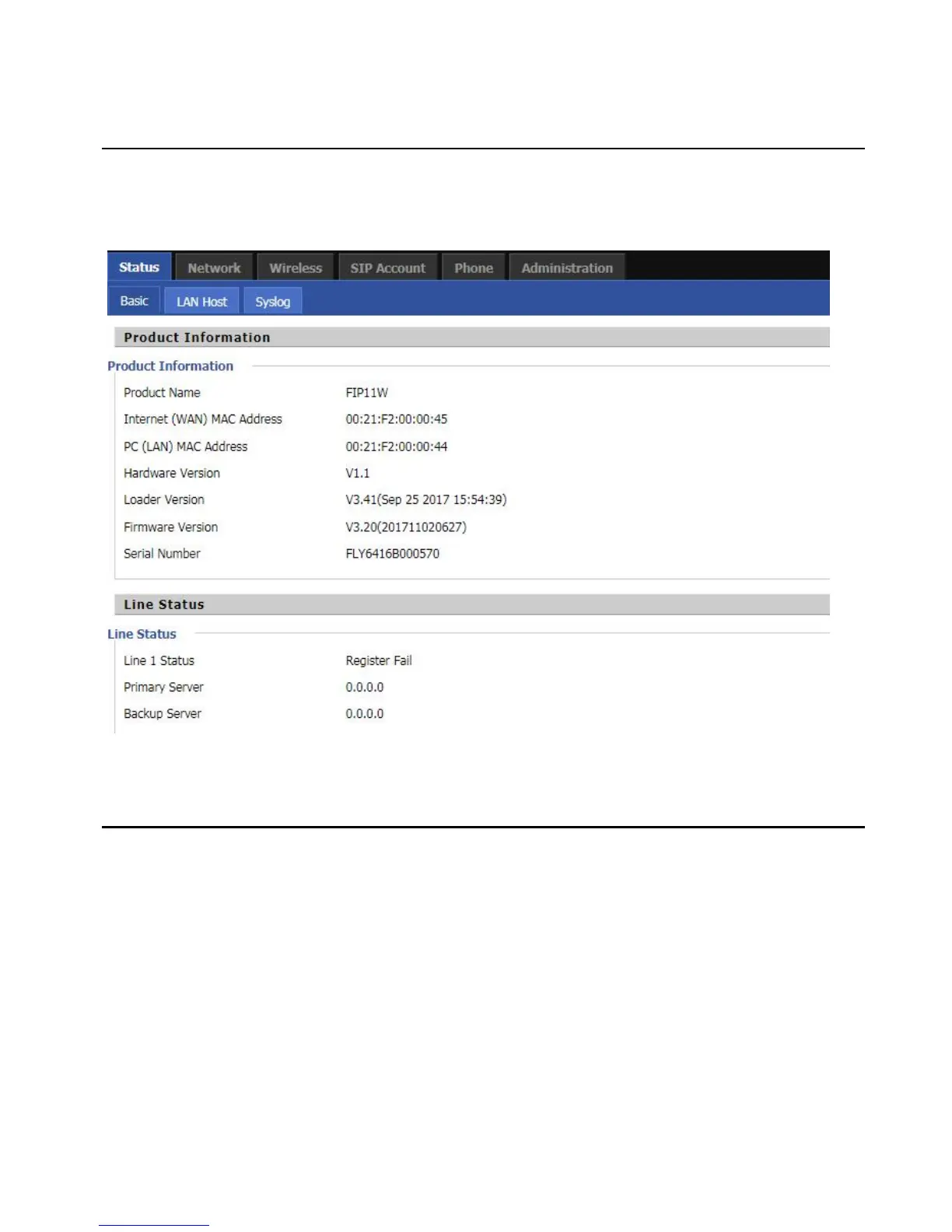 This webpage shows the status information about the Product, Network, SIP Account Status, FXS Port Status,