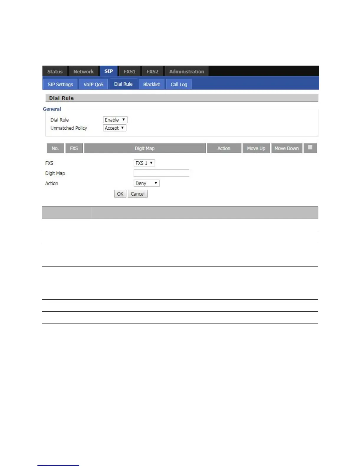Deny means router will reject the matched number, while Dial Out means router will