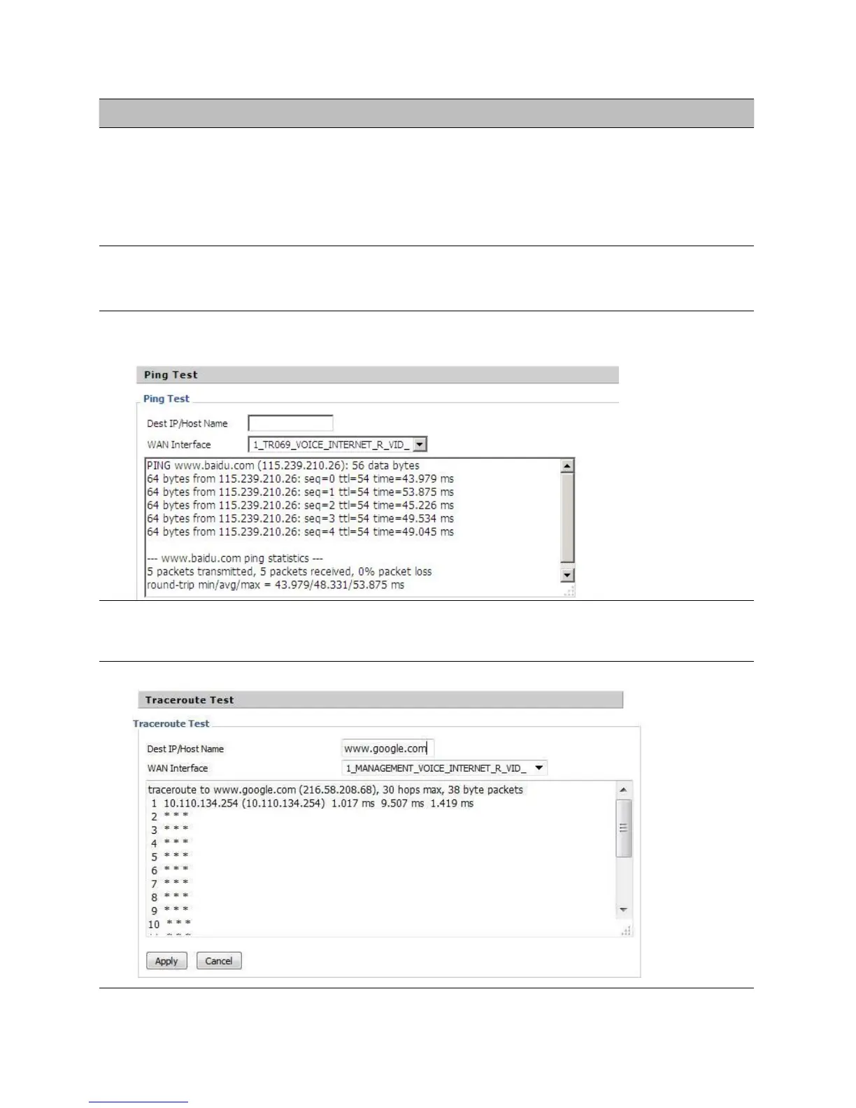 Enter the destination IP or host name, and then click Apply, device will perform traceroute test.