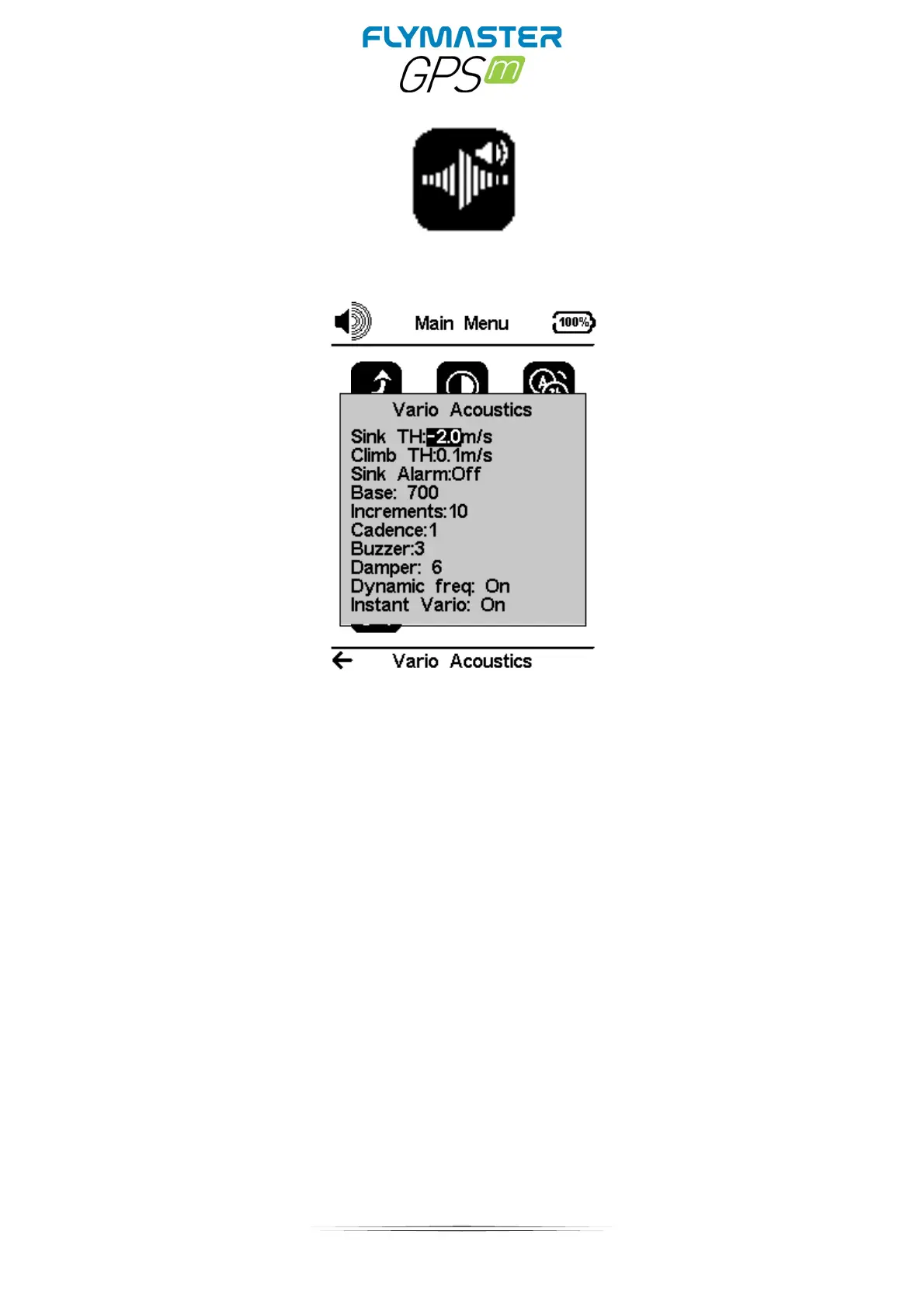 The Vario Acoustics settings menu option allows the user to change vario sound related