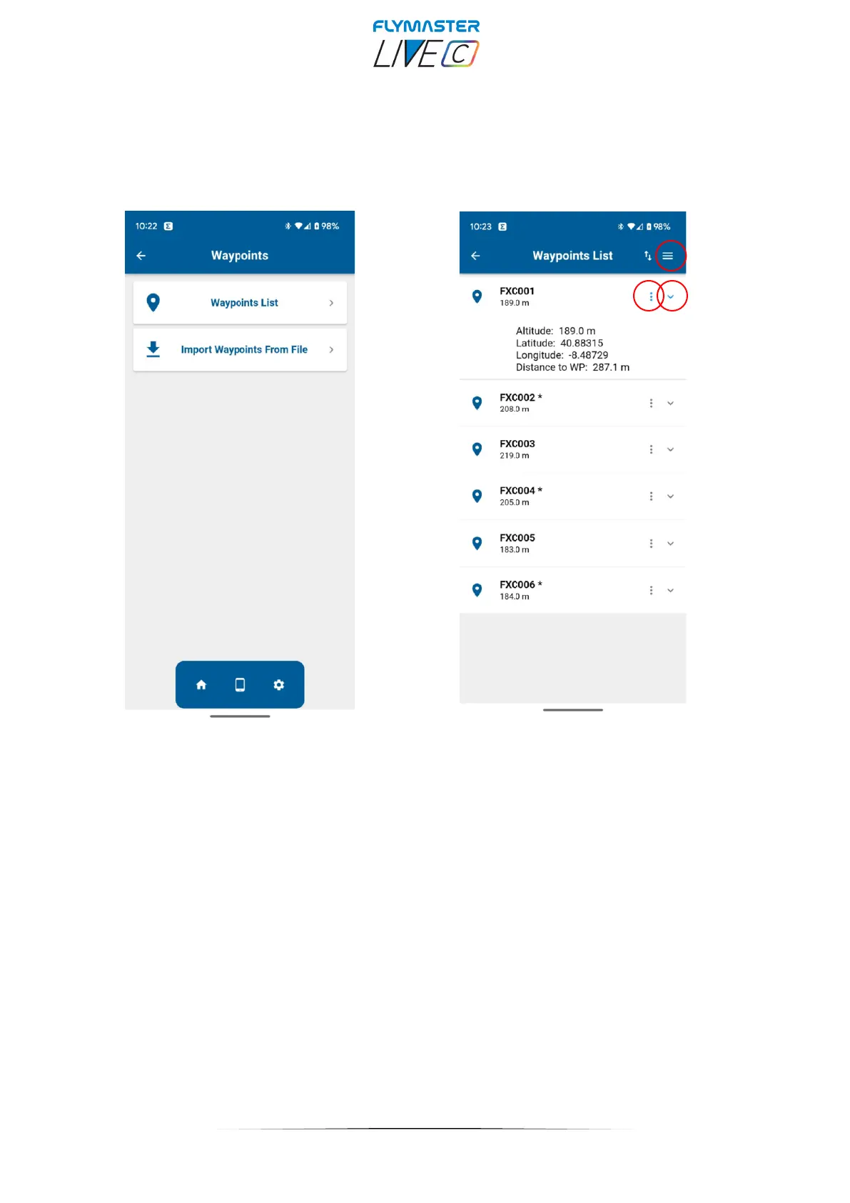 Waypoints list - List of recorded waypoints from the Flymaster Link app. There are tools in the waypoint