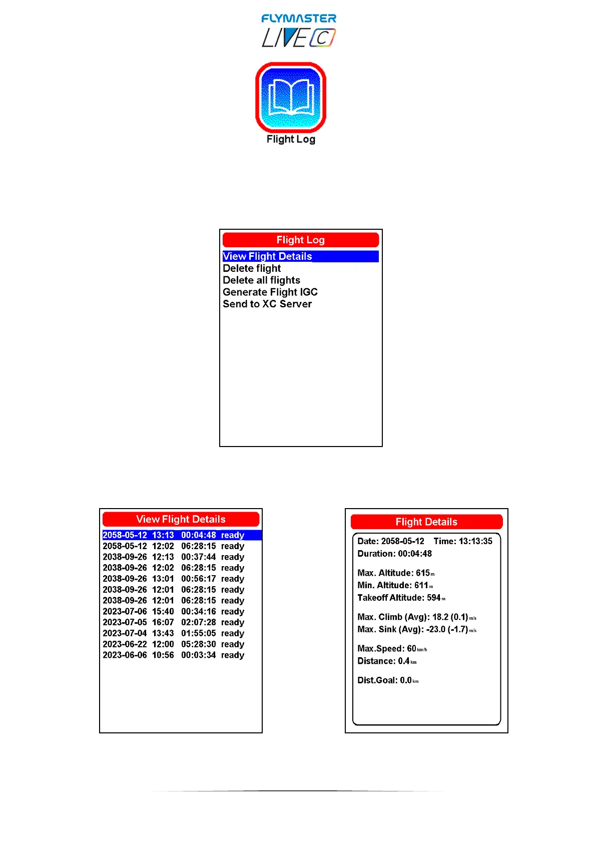 The Flight Log option allows the user to access information about previous saved flights .Using the up and