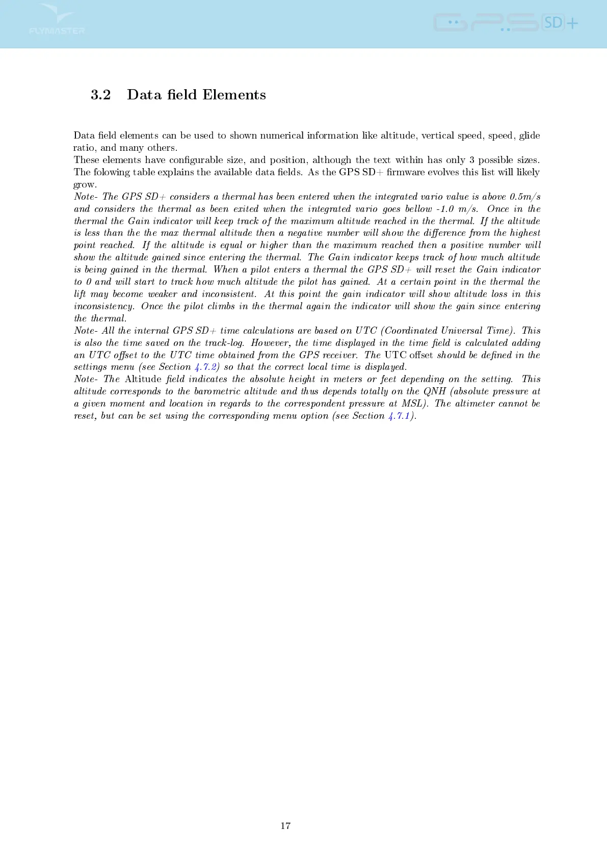 The folowing table explains the available data elds. As the GPS SD+ rmware evolves this list will likely