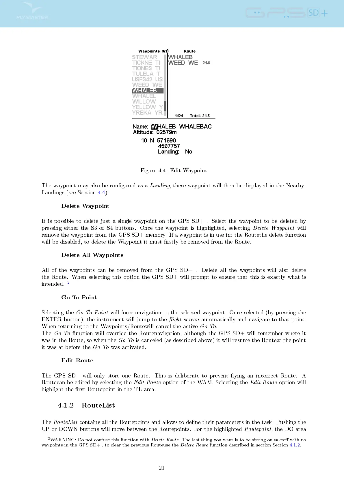 remove the waypoint from the GPS SD+ memory. If a waypoint is in use int the Routethe delete function