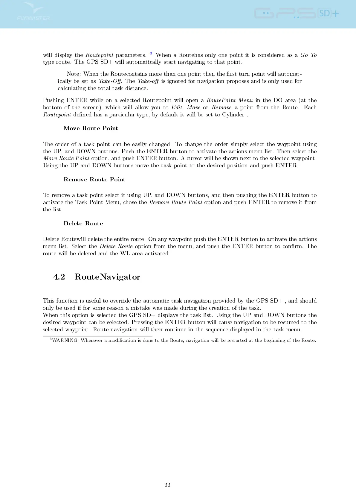This function is useful to override the automatic task navigation provided by the GPS SD+ , and should