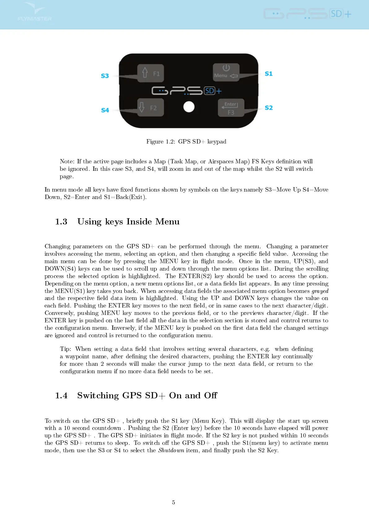 up the GPS SD+ . The GPS SD+ initiates in ight mode. If the S2 key is not pushed within 10 seconds