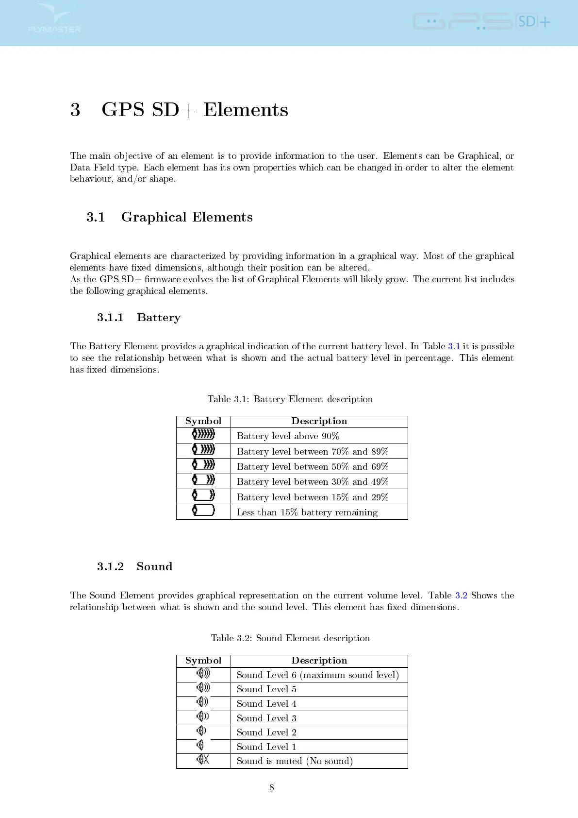 The Battery Element provides a graphical indication of the current battery level. In Table 3.1 it is possible