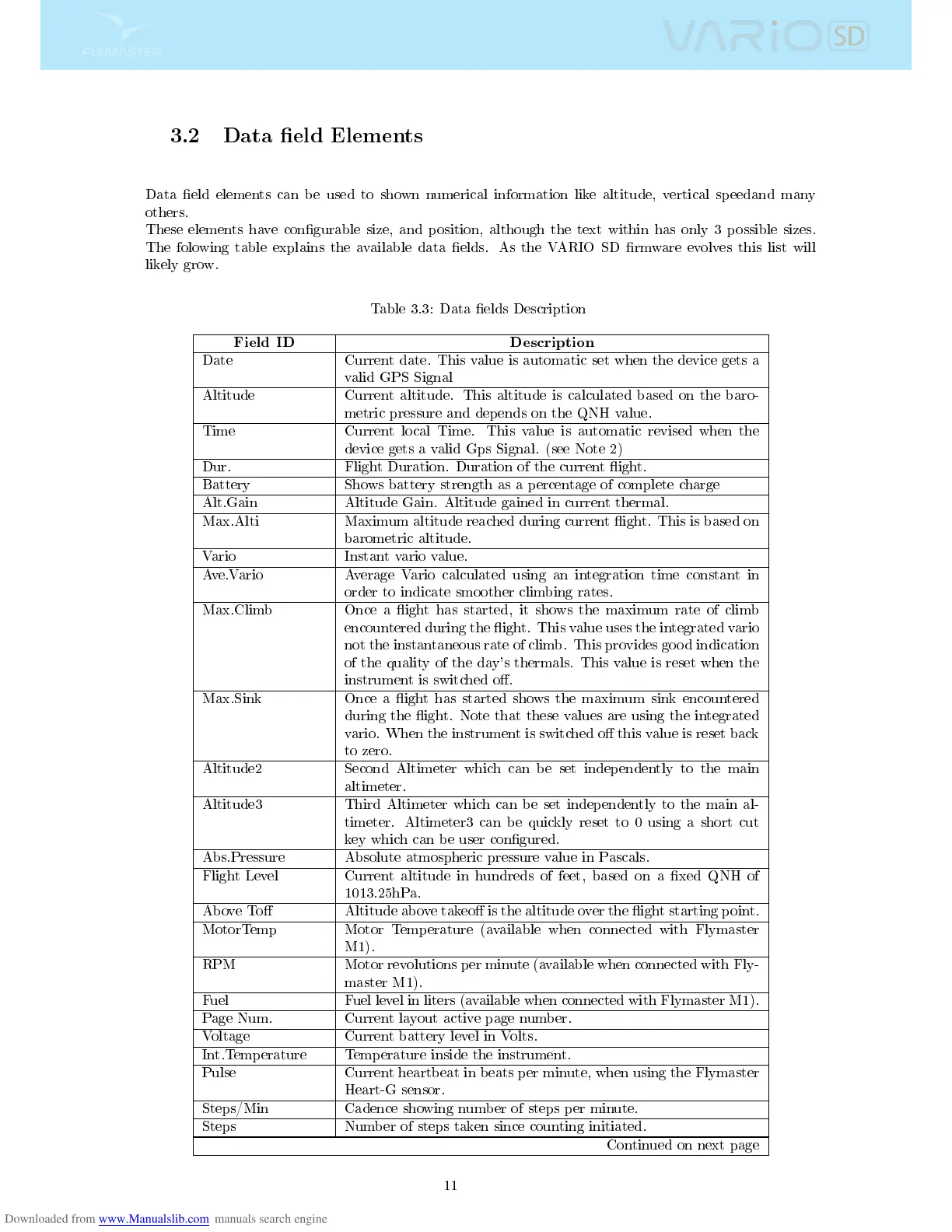 The folowing table explains the available data elds. As the VARIO SD rmware evolves this list will