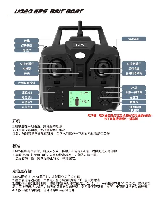 3.当船体行驶到目的地时,按紧OK键再短按定位点1、2、3、4,一页最多存储4个定位点,操作成功