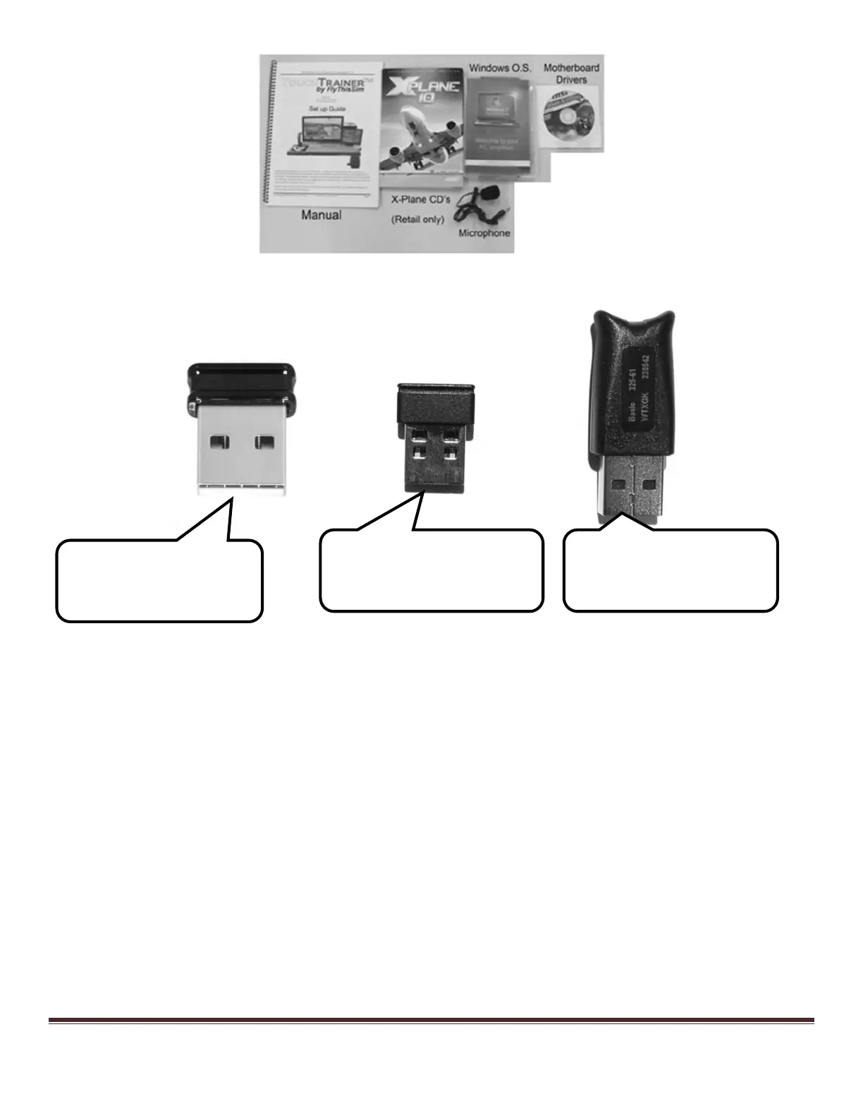 FlyThisSim TouchTrainer - Figure 1: Accessories, Cds, and Manual; Figure 2: USB Adapters