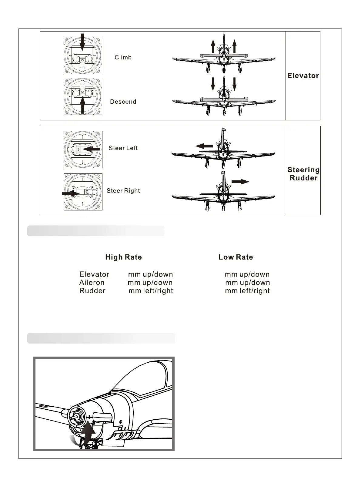 Tips: At first flight, fly the model in low rate. The first time you use high rates, be sure to fly at low to medium