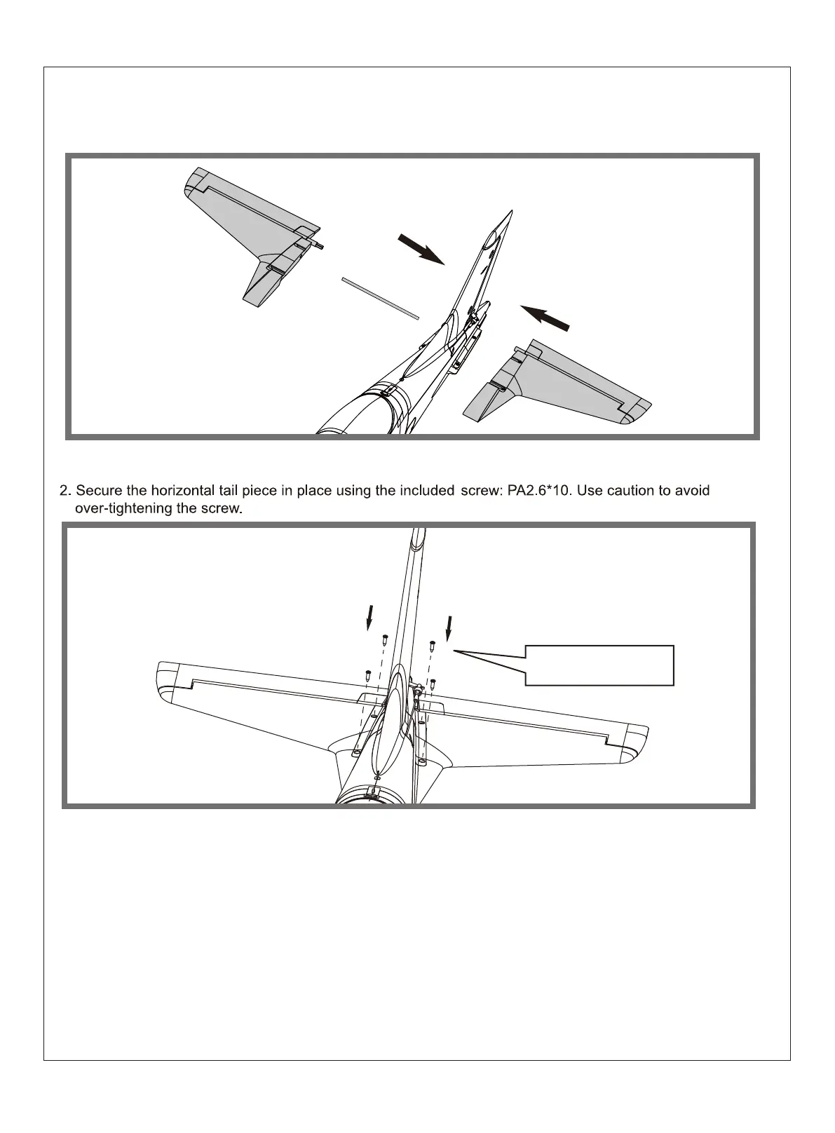 1. Slide the horizontal tail into the slot in the rear of the fuselage. Ensure the control horn is face .