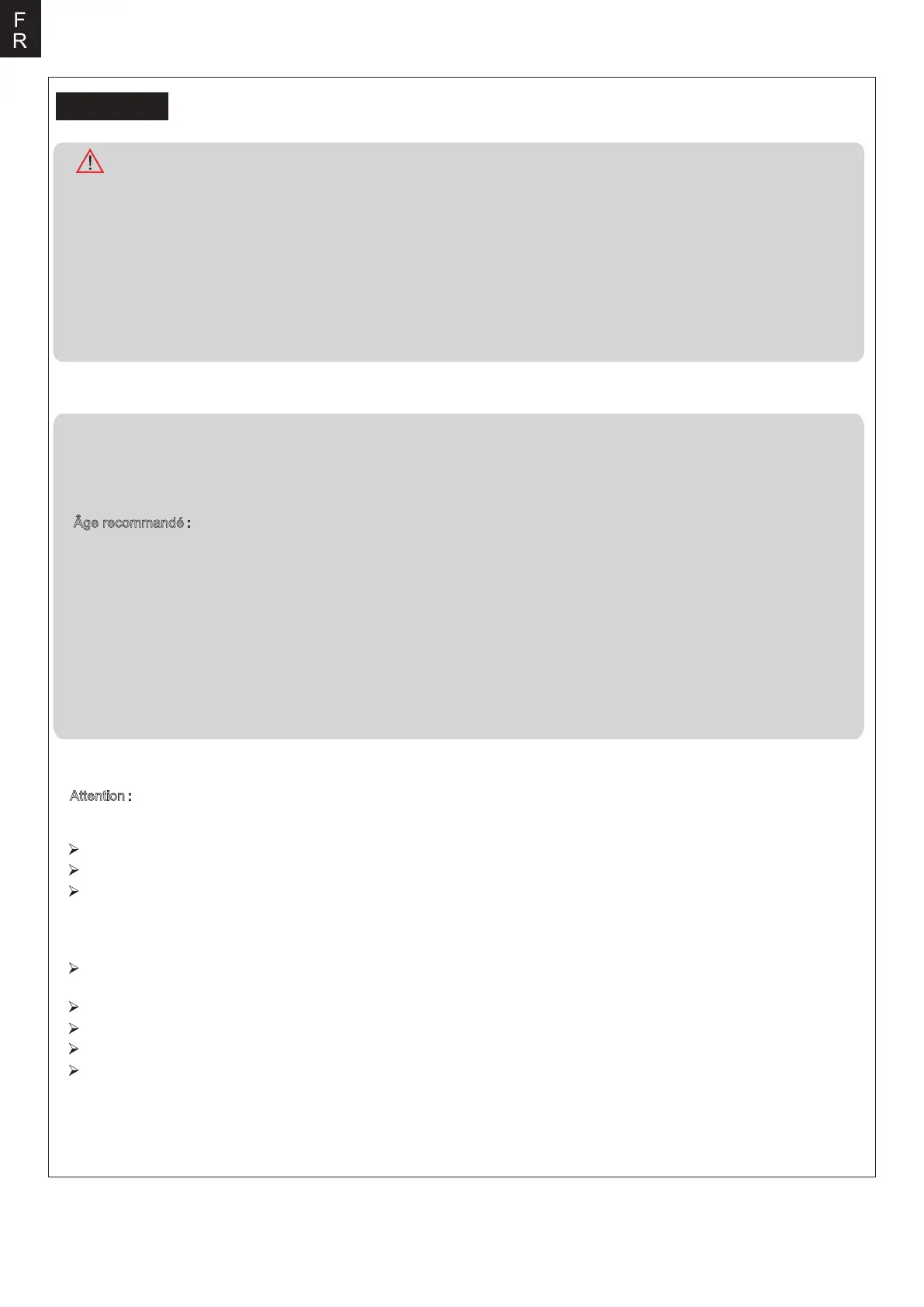 entraîner des blessures ou des dégâts au produit et envers des tiers. Ce produit n’est pas prévu pour une utilisation par des