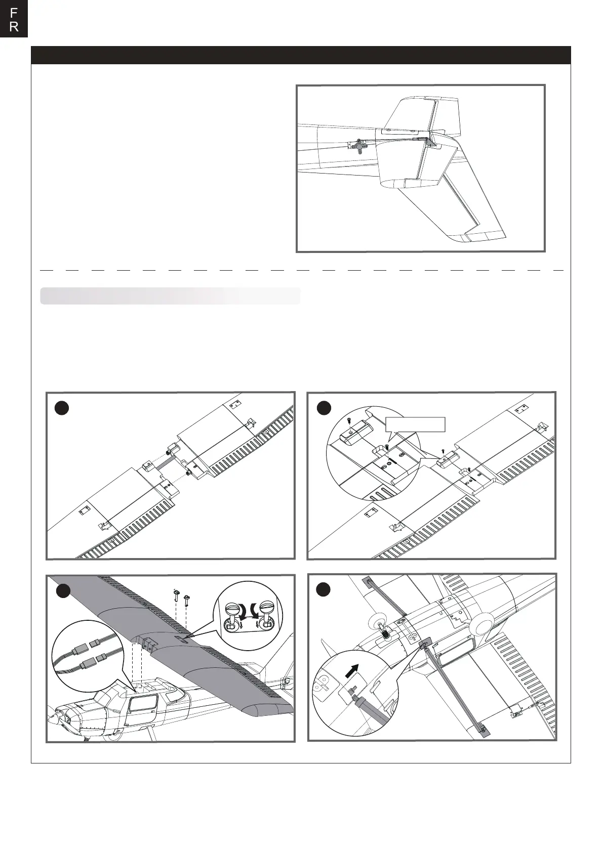 3. Branchez les fils des servos d’ailerons sur leurs prises respectives, puis placez l’aile sur le fuselage. Fixez l’aile sur le