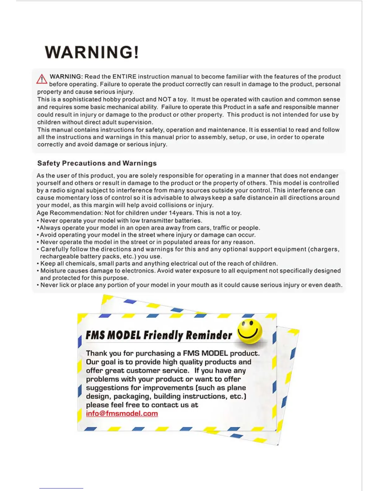 FMS 800mm Fox - WARNING!; Safety Precautions and Warnings