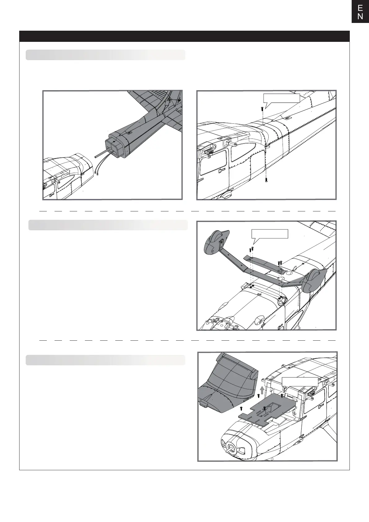 2.Use the attached screws (HKM3.0*10 X 2) to secure the front and rear fuselage in place from the top and bottom