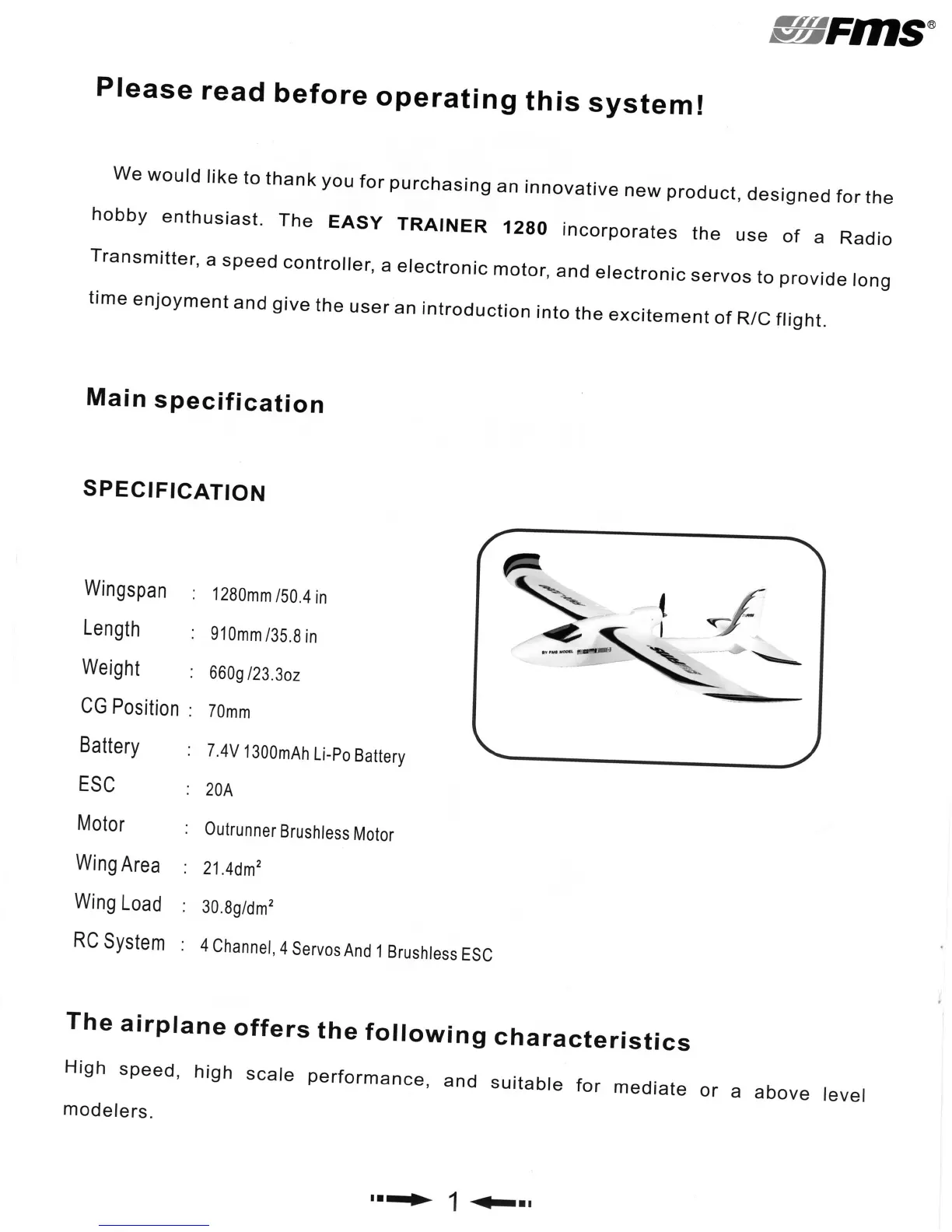 FMS Easy Trainer 1280 - System Operation Introduction; Aircraft Specifications; Aircraft Characteristics